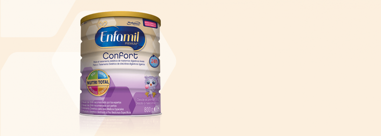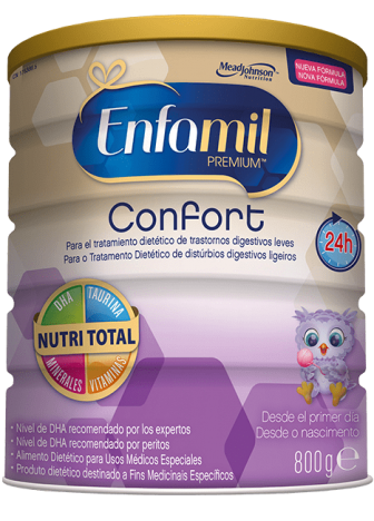 O sistema digestivo do bebé e seu sistema imunitário são imaturos no nascimento. Enfamil Premium Confort é um alimento dietético para fins medicinais específicos. É um leite parcialmente hidrolisado, significa que as proteínas foram fragmentadas em tamanhos menores, tornando-o mais fácil de digerir. Enfamil Premium Confort contém lactose em quantidade reduzida quando comparado com uma fórmula para lactentes padrões. Isso faz com que os bebés com distúrbios digestivos leves, como regurgitação, formação de gás, tenham uma melhor digestão. Enfamil Premium Confort contém uma mistura especial de DHA, taurina, vitaminas e minerais para o crescimento e desenvolvimento do bebé.